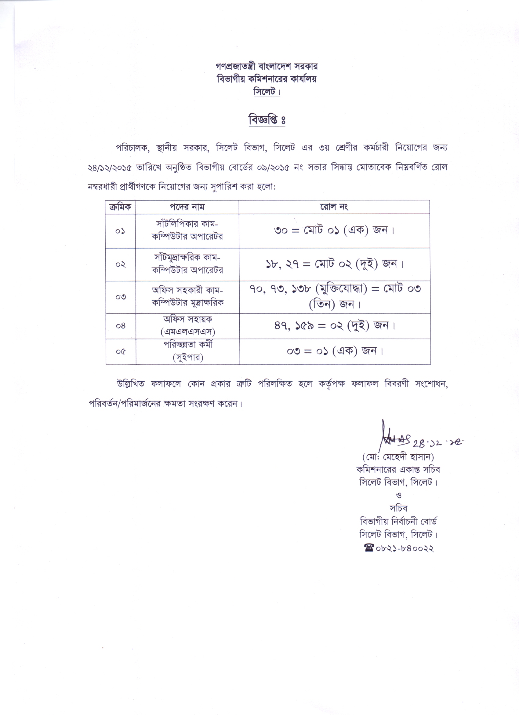 পরিচালক, স্থানীয় সরকার, সিলেট বিভাগ, সিলেট এর ৩য় শ্রেণীর কর্মচারী নিয়োগের চুড়ান্ত ফলাফল।
