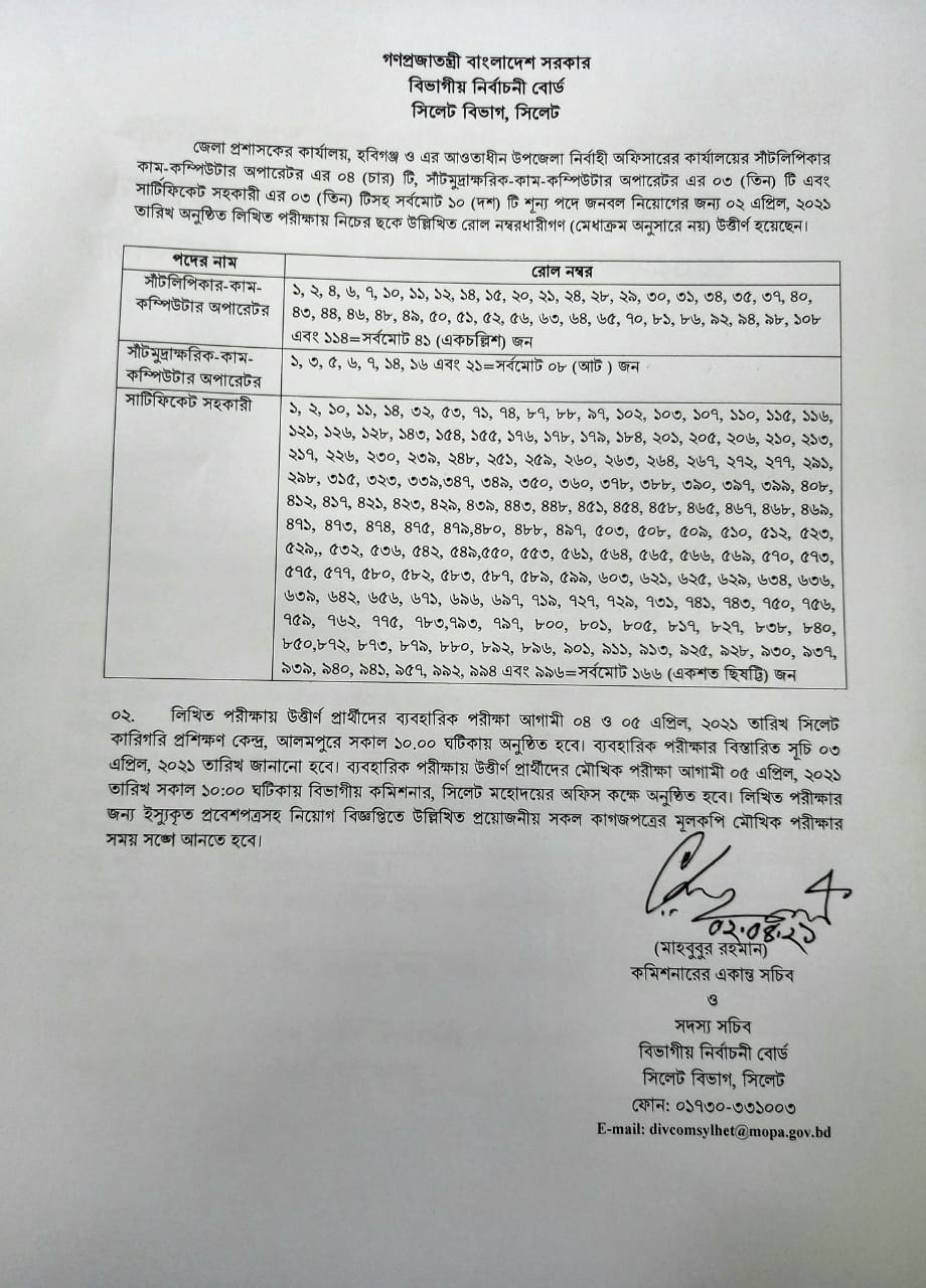 জেলা প্রশাসকের কার্যালয় হবিগঞ্জ ও এর আওতাধীন উপজেলা নির্বাহী অফিসারের কার্যালয় সাঁটলিপিকার কাম কম্পিউটার অপারেটর সাঁট মুদ্রাক্ষরিক কাম কম্পিউটার অপারেটর এবং সার্টিফিকেট সহকারী এর লিখিত পরীক্ষার ফলাফল