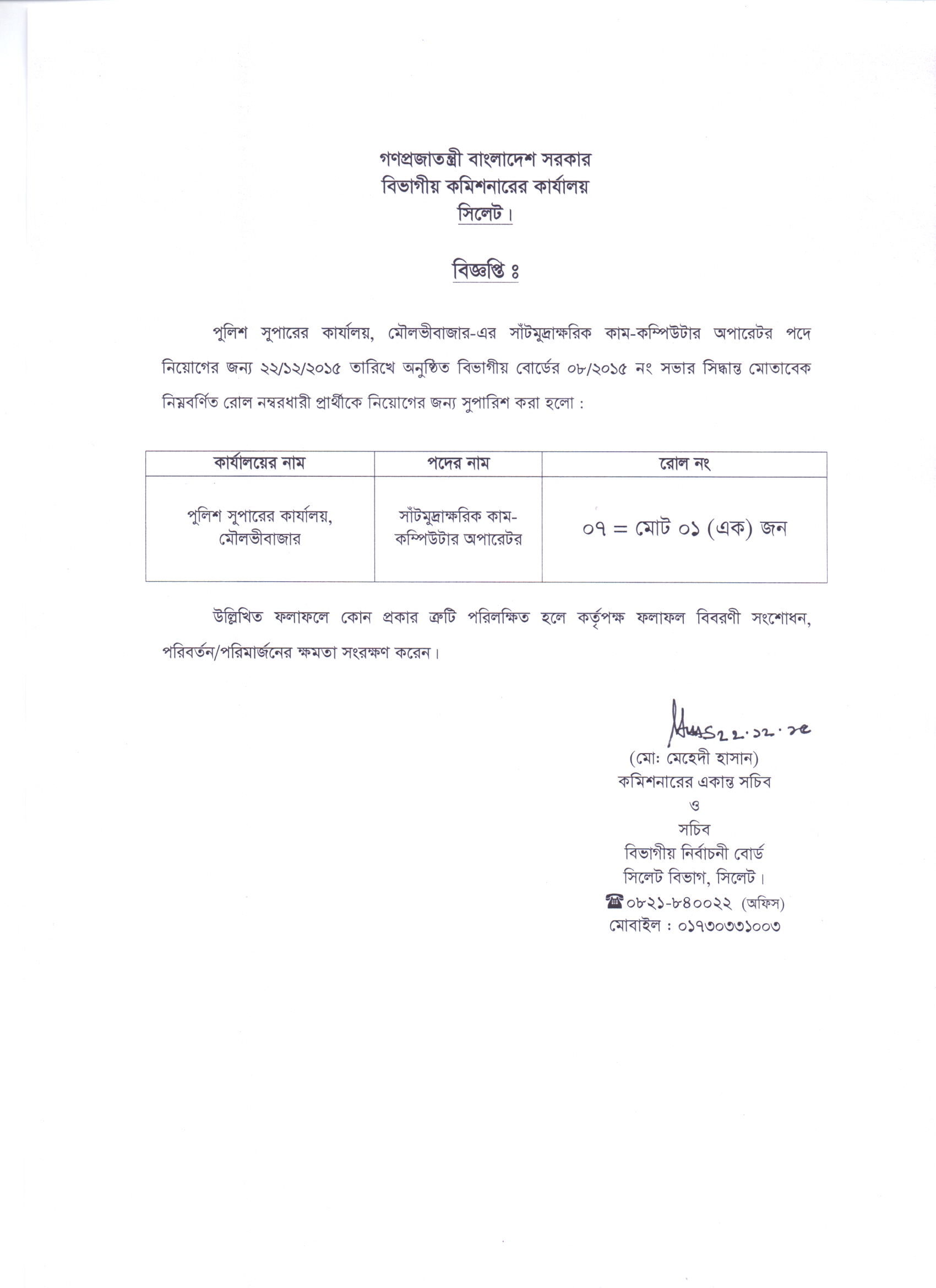 পুলিশ সুপারের কার্যালয়, মৌলভীবাজার এর দপ্তরে সাঁটমুদ্রাক্ষরিক-কাম-কম্পিউটার অপারেটর নিয়োগ পরীক্ষার চুড়ান্ত ফলাফল