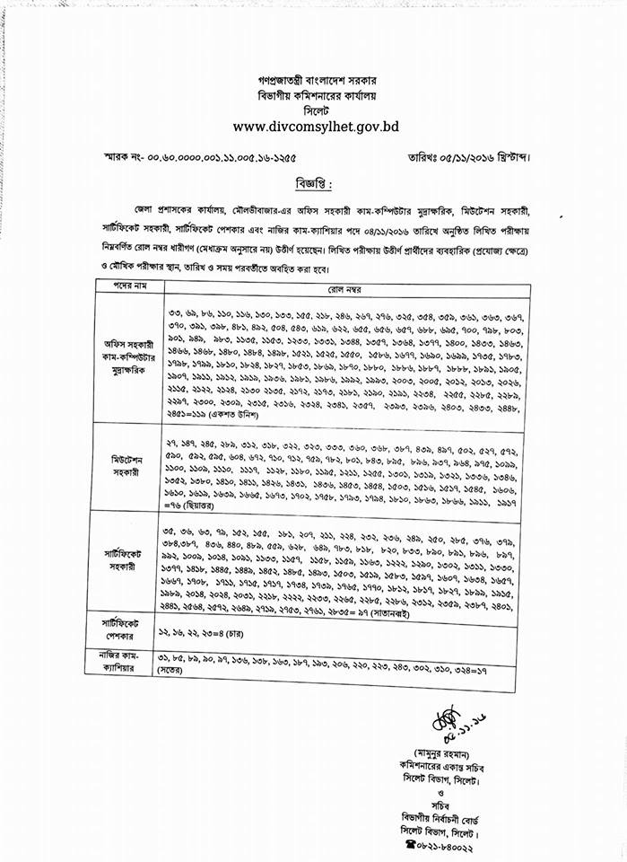 গত ০৪/১১/২০১৬ তারিখে অনুষ্ঠিত বিভাগীয় নিয়োগ পরীক্ষা ২০১৬ (মৌলভীবাজার) এর লিখিত পরীক্ষার ফল প্রকাশ করা হয়েছে।